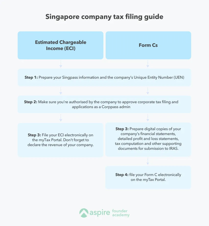 Two key filings must be submitted to ACRA: the Estimated Chargeable Income (ECI) form and the Form C/Form C-S/Form C-S Lite.