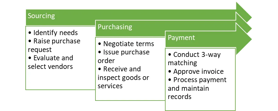 There are 3 broad stages in the procurement process – sourcing, purchasing, and payment.