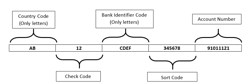 Here, the initial two characters indicate the country code, consisting of letters. The following two characters indicate the numeric check digits. The remaining characters represent a lengthy and comprehensive bank account number.